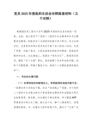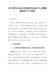党工委书记2025年度组织生活会个人对照检查材料(五个对照)各位同志:大家好。根据本次组织生活会的要求,会前,我深入学习了党的二十大和二十届四中全会精神,重温了《中国共产党章程》等党内法规,并与支部部分党员同志开展了深入的谈心谈话,广泛听取了意见建议。在此基础上,我紧扣党员身份本色、岗位履职实效、作风建设细节,深入查摆了自身存在的问题,剖析了问题根源,明确了整改方向。下面,我将个人对照检查情况汇报如下,请各位同志批评指正。一、存在的问题(一)在贯彻党的创新理论方面,存在学用脱节日现象一是理论学习存在“温差”。作为一名党员干部,虽然能够按时参加集体学习,但在个人自学上投入的精力还不够,主动性、计...