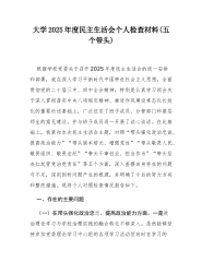XX智能衡器计量产业园发展有限公司2025年度民主生活会班子对照检查材料(五个带头)根据公司2025年度民主生活会的工作安排,领导班子紧扣会议主题,深入学习贯彻习近平新时代中国特色社会主义思想和党的二十届三中、四中全会精神,并结合深入贯彻中央八项规定精神学习教育,通过多种形式广泛征求意见,深入开展谈心谈话,全面梳理检视问题。在此基础上,班子成员从思想深处进行党性分析,认真查摆不足,深刻剖析根源,明确了整改方向。现将班子对照检查情况报告如下。一、存在的主要问题(一)在带头强化政治忠诚、提高政治能力方面一是理论学习成果向实践转化的效能有待提升。班子在组织学习贯彻党中央大政方针时,能够做到及时跟进、...