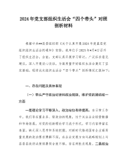 2024年度民主生活会、组织生活会个人对照检查发言材料(四个带头)(1)根据市委《关于召开2024年度民主生活会的通知》有关要求和局党组相关工作部署,我紧扣本次专题民主生活会主题,聚焦“四个带头”总体要求,坚持问题导向,认真学习研讨,开展谈心谈话,深入查摆和梳理自身存在的问题,深刻剖析原因,并提出整改方案,落实整改措施。按照会议安排,现对照检查如下:一、存在的主要问题(一)带头严守政治纪律和政治规矩,维护党的团结统一方面。一是对政治信仰的重要作用认识不够深刻。虽然始终坚定政治信仰,但在实际工作中,未能充分认识到政治信仰对工作的引领作用。例如,在面对复杂多变的工作任务时,有时会因任务繁重而忽视从...