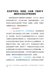 党支部“学党史、悟思想、办实事、开新局”专题组织生活会召开情况报告按照市委党史学习教育领导小组的要求,X月X日,我公司党支部在集中学习、深入谈心谈话、查摆问题的基础上,以全体党员大会形式认真开展了“学党史、悟思想、办实事、开新局”专题组织生活会。现将情况报告如下:一、会前准备情况(一)精心组织集中学习,打牢思想基础。党支部组织党员认真学习党中央指定的X本学习材料,以“学史明理、学史增信、学史崇德、学史力行”为主题开展集中研讨X次,以党史学习教育为主要内容开展党课2次。并组织党员集中学习习近平总书记在庆祝中国共产党成立100周年大会上的重要讲话,开展集中学习研讨。同时,加强个人学习,党支部提出学...
