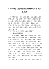 2023年度主题教育组织生活会支部班子发言提纲学习贯彻习近平新时代中国特色社会主义思想主题教育开展以来,XX党支部认真学习贯彻习近平新时代中国特色社会主义思想,突出加强党的政治建设,突出求真务实抓落实,围绕围绕“学思想、强党性、重实践、建新功”的总要求,深入开展研讨交流,广泛征求意见建议,普遍开展谈心谈话,结合工作实际,查找突出问题,研究制定整改措施,明确了今后努力方向。现将对照检查情况汇报如下:一、检视出的主要问题(一)组织开展主题教育方面。能够严格按照中央和省市县委相关要求扎实开展主题教育,认真研读党的二十大报告、党章等必学篇目,实现了凝心铸魂筑牢根本、锤炼品格强化忠诚、实干担当促进发展、...
