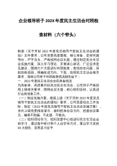 企业领导班子202X年度民主生活会对照检查材料(六个带头)根据《关于开好2022年度党员领导干部民主生活会的通知》文件要求,公司党委高度重视、精心准备,坚持问题导向,严字当头,严格按照会议主题,通过制定民主生活会实施方案、深入学习理论、开展谈心谈话、广泛征求意见建议,围绕六个方面进行对照检查,查找存在问题,深刻剖析原因,明确改进方向。下面,按照民主生活会相关要求,现将公司班子对照检查情况报告如下:一、2022年度民主生活会会前准备情况为高标准、高质量开好此次民主生活会,公司班子严格按照上级相关要求,围绕会议主题,精心组织安排,认真进行会前准备工作。(一)制定实施方案。根据上级《关于开好2022...