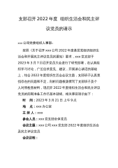 党支部2022年度组织生活会召开情况和民主评议党员工作汇报XX党委:按照部署安排,XX党支部认真组织开展2022年度组织生活会,现将有关情况汇报如下。一、会议组织情况会前,XX党支部聚焦会议主题,组织党员深入学习党的二十大精神和党章,学习习近平总书记在党的二十届一中全会上的重要讲话精神,以及总书记关于党的建设的重要论述。支部书记XX同志同所有支部成员开展谈心谈话,广泛听取对支部建设的意见建议。每位同志结合工作做了充分准备,认真撰写发言材料,对照要求、剖析自身、查找问题,并提出整改方向。2023年1月X日下午,XX支部在XX地点召开组织生活会,应到XX人,实到XX人(XX同志请假),会议由支部书...