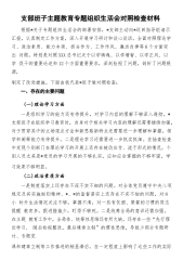 支部班子主题教育专题组织生活会对照检查材料根据*关于专题组织生活会的部署安排,*支部主动向*巡回指导组请示汇报,认真制定工作方案,深入开展学习研讨和谈心谈话,全面对照理论学习、政治素质、能力本领、担当作为、工作作风、廉洁自律等6个方面突出问题,特别是对照XXX总书记关于以学铸魂、以学增智、以学正风、以学促干的重要论述和12个方面重要要求,深刻检视了问题,剖析了问题根源,制定了改进措施。下面由我代表*班子做对照检查:一、存在的主要问题(一)理论学习方面一是组织学习的能力还有待提升,对学习内容的理解不够深入透彻。*支部班子在组织学习教育时,自身对于相关学习内容的理解还需要继续加强,对于贯穿其中的立...