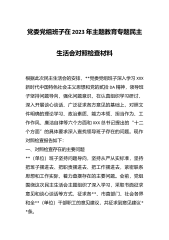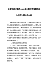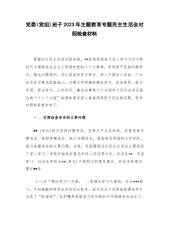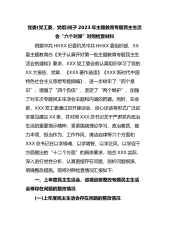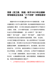 根据*纪委机关*组织部、*委主题教育办《关于认真开好第一批主题教育专题民主生活会的通知》要求,*党工委会前认真组织学习了党的二十大报告、党章、《习近平著作选读》《习近平新时代中国特色社会主义思想专题摘编》,进一步树牢了“四个意识”、增强了“四个自信"、坚定了“两个维护",加强了对本次专题民主生活会主题和内涵的把握。同时,在会前,*党工委通过召开座谈会、谈心谈话等形式广泛征求意见建议*条,并对照习近平总书记关于严肃党内政治生活的重要指示精神,紧紧围绕理论学习、政治素质、能力本领、担当作为、工作作风、廉洁自律等六个方面和习近平总书记在以学铸魂、以学增智、以学正风、以学促干方面提出的“十二个方面”的...