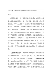 同志们:今天很高兴参加我们支部的组织生活会,刚才听了政府办党支部的半年工作总结,看得出来,做了不少事情,取得了不错成绩,望继续保持。稍后,还将分党小组召开专题组织生活会,希望大家本着“团结—批评—团结”的原则,本着对自己、对同志负责的公心,深刻剖析和开展批评与自我批评。借此机会,我就学习贯彻习近平总书记“七一”重要讲话精神,推动党史学习教育走深走实,做好政府办工作,有几个观点跟大家分享。一、奋进新征程,坚持党的全面领导不动摇“办好中国的事情,关键在党。”在庆祝中国共产党成立100周年大会上,习近平总书记深情回顾我们党百年奋斗的光辉历程,着眼实现中华民族伟大复兴的中国梦,明确提出以史为鉴、开创未...