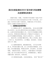 某区纪委监委机关关于某市委专项巡察整改进展情况的报告根据市委统一部署,市委第*专项巡察组于2023年*月*日至*月*日对*区纪委监委机关开展了专项巡察,并于2024年*月*日反馈了巡察意见。根据巡察工作有关要求,现将巡察整改进展情况报告如下。一、巡察整改组织领导情况(一)坚持以上率下,压实整改责任。坚决扛起巡察整改主体责任,成立委主要领导任组长的巡察整改工作领导小组,全面负责组织推进整改工作。及时召开巡察整改专题民主生活会,聚焦巡察反馈意见深入开展批评与自我批评,切实打牢巡察整改思想基础。委机关主要负责人、分管负责人、部室负责人切实履行整改责任,建立工作机制,推进工作落实,形成领导带头、全员覆...