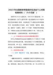 2023年主题教育专题组织生活会个人对照检查材料(“六个方面”)按照中共XXXX纪委机关、中共XXXX委组织部、XX委主题教育办《关于认真开好第一批主题教育2023年度专题生活会的通知》要求,会前我进行了认真的自学和专题集中学,结合思想和工作实际,紧扣“学思想、强党性、重实践、建新功”总要求,围绕“六个方面”开展批评和自我批评,开展谈心谈话以及开展意见征集到XX条,归纳XX条,深挖问题根源,认真制定整改措,现对照检查如下:一、上一年度组织生活会存在问题的整改情况针对上年度组织生活会自己查摆的XX个方面XX个问题和同志们批评提出的问题,我先后制定了XX条整改措施,坚持对标对表、举一反三,统筹抓好...