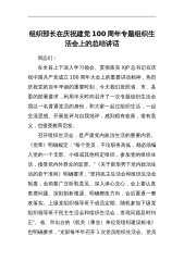 同志们:今天很高兴参加我们支部的组织生活会,刚才听了政府办党支部的半年工作总结,看得出来,做了不少事情,取得了不错成绩,望继续保持。稍后,还将分党小组召开专题组织生活会,希望大家本着“团结—批评—团结”的原则,本着对自己、对同志负责的公心,深刻剖析和开展批评与自我批评。借此机会,我就学习贯彻习近平总书记“七一”重要讲话精神,推动党史学习教育走深走实,做好政府办工作,有几个观点跟大家分享。一、奋进新征程,坚持党的全面领导不动摇“办好中国的事情,关键在党。”在庆祝中国共产党成立100周年大会上,习近平总书记深情回顾我们党百年奋斗的光辉历程,着眼实现中华民族伟大复兴的中国梦,明确提出以史为鉴、开创未...