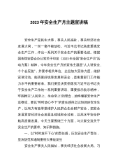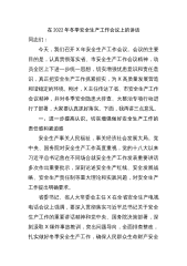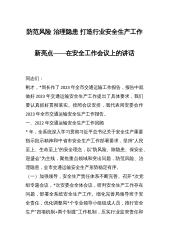 防范风险治理隐患打造行业安全生产工作新亮点——在安全工作会议上的讲话同志们:刚才,*局长作了2023年全市交通运输工作报告,报告中就做好2023年交通运输安全生产工作提出了具体要求,我们要认真抓好贯彻落实。按照会议安排,我代表局安委会作2023年全市交通运输安全生产工作报告。一、2022年交通运输安全生产工作回顾*年,全系统深入学习贯彻习近平总书记关于安全生产重要指示批示精神和中省市安全生产工作部署要求,坚持“人民至上、生命至上”的安全理念,以“防风险、除隐患、保安全、迎盛会”为主线,聚焦重点领域和突出问题,防范风险、治理隐患,全市交通运输安全生产形势稳定有序。(一)加强领导,安全生产责任体系...