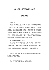 X县长在全县安全生产、消防安全、防汛抗旱和地质地震灾害防治工作会议上的讲话同志们:在今天全省安全生产暨防汛抗旱工作会议和全市安全生产、消防安全、防汛抗旱和地质地震灾害防治会议结束后,我们紧接着召开全县安全生产、消防安全、防汛抗旱和地质地震灾害防治工作会议。主要目的就是迅速传达省市会议精神,安排部署全县当前以及今后一个时期的安全生产、消防安全、防汛抗旱和地灾防范相关工作,为全县高质量发展提供良好环境保障。刚才县安委办、消安委办通报了全县近期安全生产、防汛抗旱和消防安全形势,对下一步的工作提出了很好的工作建议。XX、XX同志分别对今年地质地震灾害防治和防汛抗旱工作讲了非常具体、非常细致的要求,我都...