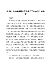 在2022年局直系统安全生产工作会议上的讲话同志们: 今天我们召开局直系统安全生产工作会议,主要任务是深入学习贯彻XJP总书记关于安全生产的重要论述和重要指示批示精神,认真落实省安委会2022年第一次全体成员会议精神,分析当前局直系统安全生产形势,部署2022年局直系统安全生产工作,进一步压紧压实局安委会成员单位的行业安全生产监管责任和局直单位的安全生产主体责任,力争全省林业系统安全稳定发展。刚才,X同志总结了2021年局直系统安全生产工作,提出了2022年局安委会工作计划,我都赞成。事务中心、种苗中心和X林场作了安全生产工作经验交流,大家要相互学习借鉴。局直各单位递交了《2022年安全生产...