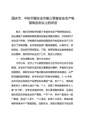 国庆节、中秋节暨在全市第三季度安全生产电视电话会议上的讲话刚才,我们共同收听收看了全省安全生产电视电话会议,会议通报了近期典型事故情况和省反馈意见情况,分析研判了安全生产形势,并就做好当前特别是国庆节前后安全生产工作进行了安排部署。全市各级各部门要高度重视,认真学习、深刻领会,切实抓好贯彻落实。下面,就贯彻落实全省电视电话会议精神,做好我市安全生产工作,我讲三点意见:一、保持清醒忧患,提升安全意识今年以来,全市上下认真贯彻落实习近平总书记关于应急管理、安全生产和防灾减灾救灾重要指示精神,牢固树立安全发展理念,狠抓安全生产重点整治和双重预防体系建设,从严防范遏制各类事故,全市安全生产形势总体稳定...