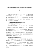 公司纪委关于安全生产监督工作的经验交流为深入学习贯彻党的二十届三中全会、二十届中央纪委三次全会精神,进一步落实集团“一六六”战略路径决策部署,市政公司纪委立足主责主业,瞄准薄弱环节,突出问题导向,抓实抓细安全生产监督工作,确保“四个到位”,多角度织密安全生产防护网。一、组织落实到位,积极开展工作部署立足工作重点,做好精准监督公司纪委立足监督职责,第一时间督促安全生产主责部门召开安委会(扩大)会议,传达学习x交通、x集团安全生产重要讲话会议精神,分析部署全年安全生产重点工作。将细化整改作为全年安全生产工作主线,制定《细化整改任务分解表》,明确完成的具体时间和责任人。签订《安全生产诚信承诺书》,对...