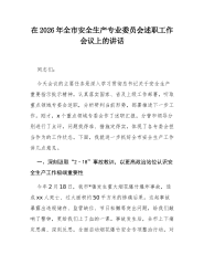 在2026年全市安全生产专业委员会述职工作会议上的讲话同志们:今天会议的主要任务是深入学习贯彻总书记关于安全生产重要指示批示精神,认真落实国家、省及上级工作部署,听取重点领域专委会述职,分析研判当前形势,部署推进下一步工作。刚才,x个重点领域专委会作了述职汇报,分管市领导分别进行了点评,问题找得准、措施定得实,体现了各专委会担当作为的工作状态。下面,我就进一步抓好全市安全生产工作讲几点意见。一、深刻汲取“2·18”事故教训,以更高政治站位认识安全生产工作极端重要性今年2月18日,我市*镇发生重大烟花爆竹爆炸事故,造成xx人死亡、过火面积约50平方米的惨痛后果。这起事故暴露出违规储存、监管缺位、...