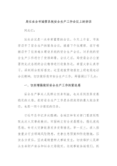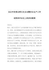 在全市安委会第五次全会暨安全生产工作述职讲评会议上的讲话提纲同志们:刚才,我们已经召开了全市烟花爆竹安全生产警示教育会议;现在,我们紧接着召开全市安委会第五次全会暨安全生产述职讲评会议。主要目的是深入贯彻习近平总书记关于安全生产的重要论述精神,以及近期省、长沙市相关会议精神,认真梳理今年以来的安全生产工作,分析研判当前安全生产工作形势,研究部署下阶段安全生产工作,推动专委会全面履职、高效运转,进一步统一思想、落实举措、压实责任,坚决打好打赢安全生产保卫仗,确保全市安全生产形势稳定向好。刚才,XX汇报了全市安全生产工作情况,成绩总结很全面,问题分析很透彻,下一步工作建议也很精准。希望XX进一步强...