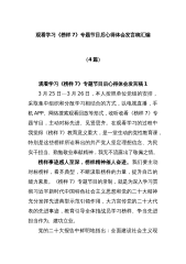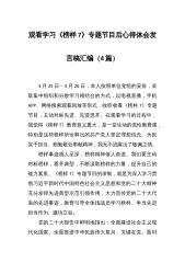 观看学习《榜样7》专题节目后心得体会发言稿汇编(4篇) 3月25日—3月26日,本人按照单位党组的安排,采取集中组织和分散学习相结合的方式,以电视直播,手机APP、网络搜索观看回放等形式,收听收看《榜样7》专题节目,主动对标先进、见贤思齐。在观看学习的过程中,我觉得《榜样7》教育意义重大,是一堂生动的党性教育课,特别是这些榜样所诠释出的共产党人坚定理想信念、为民实干担当、勤勉敬业奉献精神,我无不流露出了敬佩之情。 榜样事迹感人至深,榜样精神催人奋进。我们要主动对标榜样,看齐典型,不断汲取榜样的力量,提升自己的能力素质。《榜样7》专题节目的录制,就是为深入学习贯彻习近平新时代中国特色社会主义...
