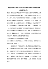 银行行长班子成员2023年“六个带头”民主生活会对照检查材料系列(五)根据xx银行党委《关于开好2022年度县以上党和国家机关党员领导干部民主生活会的通知》要求,近期,我紧扣会议主题,深入学习xx精神,系统学习习近平新时代中国特色社会主义思想,并积极参加中心组集中学习和研讨活动,紧密结合个人思想工作实际,通过征求意见、谈心交流和个人自查,深入查摆自身存在的差距和不足,深刻剖析根源,认真制定整改措施,明确了下步努力方向,进一步坚定了团结带领全县党员干部以奋发有为的精神,贯彻落实行党委作出的重大决策部署的信心和决心。下面,根据此次民主生活会要求,我紧紧围绕"六个带头"开展对照检查,现将对照检查情况...
