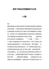 领导干部如何把握集权与分权(2篇)篇1: 摘要:集权制与分权制,是两种不同的领导体制类型,这两种类型各有利弊。任何领导系统中都有集权和分权的问题,如何处理好集权与分权的关系,关键在于如何掌握集权与分权的度。在实际工作中,要处理好集权与分权的关系,主要体现在正职与副职如何正确运用手中的权力问题。 关键词:集权与分权关系正职副职权力 “一个地区、一个部门、一个方面工作做得如何,班子状况怎样,同‘一把手’关系很大,因而必须对各级领导班子‘一把手’提出更高、更严的要求。”[1]正职领导者,是担负着总揽全局、统一指挥的全面责任的人。正职领导者的角色定位是:处于核心位置、起着关键作用、负有全面责任。这...