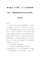 清正廉洁,严于律己,当一名合格的招商干部——招商局党支部书记在机关党课上的讲话同志们:今天,我们专门召开会议研究党风廉政建设工作,这既是深入贯彻省委十一届九次全会、市委七届十二次全体会议精神、落实招商局党支部成员全面从严治党主体责任和班子成员“一岗双责”的实际举措,也是区纪检监察工委履行和强化监督职责的现实要求,更是我局全面落实党风廉政建设和反腐败工作责任制,以严明的纪律和良好的作风推动清廉xx建设、优化营商环境等重要工作的一次再动员再发动。下面,我就进一步加强2021年全局党风廉政建设和反腐败工作,讲几点意见。一、务必认清新形势,时刻保持清醒(一)以更高的定位推进党风廉政建设和反腐败工作。要...