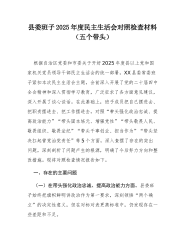 街道党工委2025年度民主生活会班子对照检查材料(五个带头)根据中央、省委、市委和县委关于开好2025年度党员领导干部民主生活会的统一部署和要求,街道党工委班子紧扣会议主题,在深入开展学习研讨、广泛征求意见建议、坦诚进行谈心谈话的基础上,认真对照本次民主生活会明确的五个方面重点内容,深入查摆突出问题,深刻剖析问题根源,明确整改方向和措施。现将班子对照检查情况报告如下。一、存在的主要问题党工委班子坚持问题导向,对照党的创新理论,对照党章党规党纪,对照初心使命,对照群众期盼,对照先进典型,紧密联系街道工作实际和班子自身建设情况,深入查摆了以下五个方面存在的突出问题。(一)在带头强化政治忠诚、提高政...