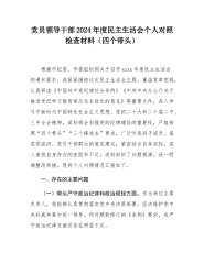 党员领导干部2024年度民主生活会个人对照检查材料(四个带头)根据市纪委、市委组织部关于召开xxxx年度民主生活会的通知要求,我紧紧围绕这次民主生活会主题,重温党章党规,认真研读《中国共产党纪律处分条例》《中共中央办公厅关于推进党纪学习教育常态化长效化的意见》等重要文件,深入学习平新时代中国特色社会主义思想、党的二十大和二十届二中、三中全会精神,深刻领会加强党的纪律建设的重要性,严格按照“四个带头”“三个摆进去”要求,广泛听取班子成员、基层党组织、党员干部群众的意见建议,紧密结合自身实际,深入查找自身存在的差距和不足,深刻剖析了问题根源,逐一明确整改举措。现将个人对照情况汇报如下。一、存在的主...