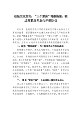 经验交流发言:“三个聚焦”精准施策,锻造高素质专业化干部队伍近年来,县始终坚持以习近平新时代中国特色社会主义思想为指导,紧紧围绕新时代建设高素质专业化干部队伍要求,聚焦“精准画像”“双百工程”“暖心行动”三大措施,着力建设一支具备领导现代化建设能力的高素质、专业化干部队伍,为推动x经济社会高质量发展提供坚强组织保障。一、聚焦“精准画像”,为干部培养工作夯实基础着眼建设好班子、发现使用好干部,打造高素质专业化领导干部队伍,采取定期分析、经常性研判、专项调研等方式,全方位、多维度分析研判领导班子运行和领导干部履职情况。通过干部自我“构图打型”、单位党组织“铺色打底”、调研组“细节特写”、部务会“刻...