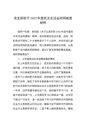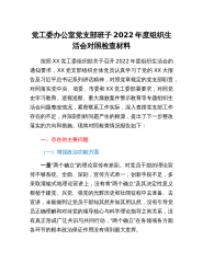 党工委办公室党支部班子2022年度组织生活会对照检查材料按照XX党工委组织部关于召开2022年度组织生活会的通知要求,XX党支部组织全体党员认真学习了党的XX大报告及习近平总书记系列讲话精神,对照党章规定的党支部职责,对照落实党中央、省委、市委和XX党工委部署要求,对照党史学习教育、巡视巡察、重大腐败案件警示教育等专题组织生活会问题整改情况,紧密联系工作实际,深入查摆党支部工作存在的不足,并深刻剖析问题产生的根源,提出了下一步整改落实的方向和措施。现将对照检查情况报告如下:一、存在的主要问题(一)增强政治功能方面一是“两个确立”的理论宣传有差距。对党员干部的理论宣传不够系统、全面、深刻,宣传方...