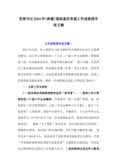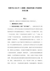 2025年基层领导、党委书记狠抓基层党建工作述职报告(6篇文)汇编供参考(工作述职报告范文稿一)2024年,在局党委的坚强领导下,我锚定年度工作奋斗目标,认真履行**党支部抓党建和全面从严治党“第一责任人”职责,带领支部全体党员坚决落实上级决策部署,强化政治建设、组织建设、队伍建设,着力提升队伍凝聚力和战斗力,圆满完成了党委交办的各项工作任务,现就一年来履职抓党建工作情况报告如下:一、年内履职情况(一)突出政治统领,凝心铸魂,党支部向心力进一步提升。一是扎实开展党纪学习教育。按照党委统一部署,组织所属党员认真开展党纪学习教育活动,参加党纪培训班暨党纪学习教育读书班,参观监狱、驻地廉政教育基地等...