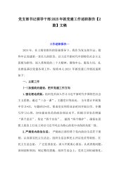 党支部书记干部2025年抓党建工作述职报告4篇与2024年党建总结及党建工作开展情况总结报告3篇合集【供参考】【工作述职报告范文稿一】2024年,在上级党组织的坚强领导下,我作为党支部书记,始终牢记党建第一责任人的职责,以习近平新时代中国特色社会主义思想为指导,深入贯彻党的二十大精神,围绕中心、服务大局,扎实推进基层党建各项工作,现将本人2024年抓党建工作情况述职如下:一、主要工作(一)加强政治建设,把牢党建工作方向1.强化理论武装。组织党员深入学习习近平新时代中国特色社会主义思想,通过“三会一课”、主题党日等活动,全年累计开展集中学习*次,专题研讨*次。要求党员利用业余时间开展自学,并撰写...