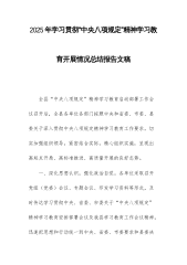 2025年学习贯彻“中央八项规定”精神学习教育开展情况总结报告文稿全县“中央八项规定”精神学习教育启动部署工作会议召开后,全县各单位各部门按照中央和省委、市委、县委关于深入贯彻中央八项规定精神学习教育工作要求,切实加强组织领导,紧密结合实际,精心组织实施,呈现出高起点开局、高标准推进、高质量开展的良好态势。一、深化思想认识,强化政治自觉。各单位采取召开党组(党委)会议、专题会议、印发学习资料等形式,及时传达学习贯彻中央、省委、市委关于“中央八项规定”精神学习教育安排部署会议及我县学习教育工作会议精神,迅速把思想和行动统一到中央、省委、市委要求和县委决策部署上来。通过学习,各单位一致认为,习近平...