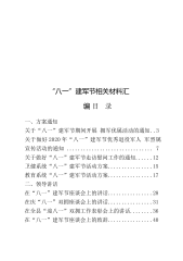 “八一”建军节相关材料汇编目录一、方案通知关于“八一”建军节期间开展拥军优属活动的通知..3关于做好2020年“八一”建军节优秀退役军人军烈属宣传活动的通知...............................7关于做好“八一”建军节走访慰问工作的通知......12卫健系统“八一”建军节活动方案................15教育系统“八一”建军节活动方案................17二、领导讲话在“八一”建军节座谈会上的讲话................28在庆“八一”双拥座谈会上的讲话................31在全县“迎八一”双拥工作表彰会上的讲话........