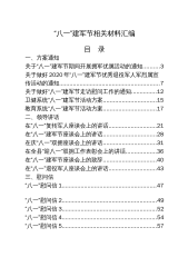 “八一”建军节相关材料汇编目录一、方案通知关于“八一”建军节期间开展拥军优属活动的通知..........3关于做好2020年“八一”建军节优秀退役军人军烈属宣传活动的通知...........................................................7关于做好“八一”建军节走访慰问工作的通知...............12卫健系统“八一”建军节活动方案...............................15教育系统“八一”建军节活动方案...............................17二、领导讲话在“八一”复转军人座谈会上的讲...