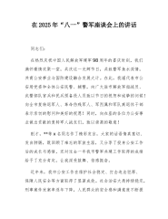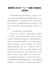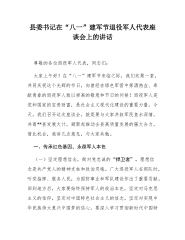 县委书记在“八一”建军节退役军人代表座谈会上的讲话尊敬的各位退役军人代表,同志们:大家上午好!在“八一”建军节来临之际,我们欢聚一堂,共同庆祝这个光辉的节日,向曾经在绿色军营中挥洒热血、奉献青春的退役军人致以崇高的敬意和节日的问候!退役军人是党和国家的宝贵财富,是社会主义现代化建设的重要力量。今天,我们召这次座谈会,就是要与大家共叙军民鱼水深情,共商**县发展大计,凝聚起推动全县高质量发展的强大合力。借此机会,我讲几点意见,与大家共勉。一、传承红色基因,永葆军人本色(一)坚定理想信念,做对党忠诚的“捍卫者”。理想信念是共产党人的精神支柱和政治灵魂。广大退役军人在部队时,听党指挥、服务人民,为国...