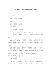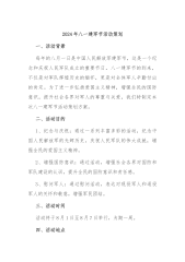 “军民鱼水情,共筑中国梦”集团庆“八一”主题活动方案为庆祝“八一”建军节,集团计划通过形式多样的军民共建活动,共叙军民鱼水情,营造“军爱民、民拥军、军民鱼水一家亲”的浓厚氛围,进一步传承和弘扬双拥光荣传统,巩固和发展坚如磐石的军政军民关系。一、活动目的及意义增强国防观念:通过活动让员工了解人民军队的历史和贡献,增强国防意识。弘扬爱国主义精神:讴歌人民解放军对国家和人民的伟大贡献,激发员工的爱国热情。感谢退伍军人:感谢并表彰为公司做出贡献的退伍军人,营造尊重军人的良好氛围。二、活动主题“军民鱼水情,共筑中国梦”——集团庆“八一”主题活动三、活动时间2024年7月31日四、活动地点公司户外广场(根...