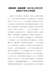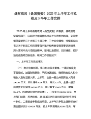 县财政局(县国资委)2025年上半年工作总结及下半年工作安排2025年上半年县财政局(县国资委)在县委、县政府的坚强领导下,以新时代中国特色社会主义思想为指导,全面贯彻落实党的二十大和二十届二中、三中全会精神,持续落实总书记关于财政工作的重要指示批示和考察安徽重要讲话精神,深入贯彻中央八项规定精神,坚持以政领财、以财辅政,较好地完成各项目标任务,现将工作总结如下:一、上半年工作完成情况(一)努力培植财源,强化财政收支管理。一是财政收支平稳增长。加强财税联动,严抓堵漏增收,确保税收收入和非税收入及时足额入库。上半年,全县一般公共预算收入完成xxxxx万元,同比增收xxx万元,增长x.x%。全县一...