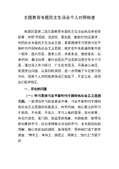 主题教育专题民主生活会个人对照检查根据区委第二批主题教育专题民主生活会的总体安排部署,对照“学思想、强党性、重实践、建新功”的总要求,对照此次专题民主生活会主题,紧紧围绕学习贯彻习近平新时代中国特色社会主义思想,维护党中央权威和集中统一领导,践行宗旨、服务人民,求真务实、狠抓落实,以身作则、廉洁自律,履行全面从严治党政治责任等6个方面,通过深入学习研讨、广泛征求意见、开展谈心谈话、查摆突出问题、认真剖析原因,进一步明确了今后努力的方向。现将个人对照检查情况汇报如下,不妥之处,请同志们批评指正。一、存在的问题(一)学习贯彻习近平新时代中国特色社会主义思想方面。一是理论学习的深度还不够。习近平新时...