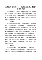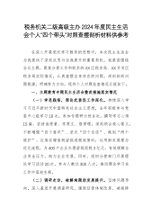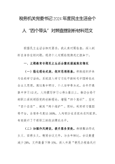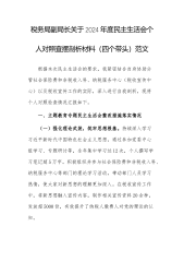 税务机关党委副书记、二级高级主办2024年度民主生活会个人“四个带头”对照查摆剖析材料供参考根据民主生活会相关要求,我结合自身工作实际,特别是分管货物和劳务税科、征收管理科、党建工作科、机关党委,联系XX区税务局、XX开发区税务局的职责,深入进行自我剖析,现将个人对照检查情况汇报如下。一、主题教育专题民主生活会整改措施落实情况(一)强化理论武装,学深悟透新思想。持续深入学习习近平新时代中国特色社会主义思想,制定了详细的学习计划,每月至少安排4次集中学习和6小时个人自学。通过参加专题研讨、撰写心得体会等方式,不断加深对新思想的理解和把握。在学习过程中,注重将理论与实际工作相结合,运用新思想指导税...