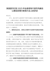 某县委书记在2025年全县领导干部作风建设以案促改警示教育大会上的讲话同志们:今天,我们召开全县领导干部作风建设以案促改警示教育大会,主要任务是深入贯彻落实党的二十大关于全面从严治党的战略部署,深刻汲取近年来我县查处的违纪违法案件教训,以刀刃向内的自我革命精神,推动作风建设向纵深发展。下面,我讲三个方面意见。一、提高政治站位,深刻认识新时代加强作风建设的极端重要性(一)加强作风建设是践行"两个维护"的政治检验。党的十八大以来,以习近平同志为核心的党中央把作风建设摆在突出位置,从制定实施中央八项规定破题,驰而不息纠治"四风",推动党风政风为之一新。当前,我县正处于推动高质量发展、实现跨越赶超的关...