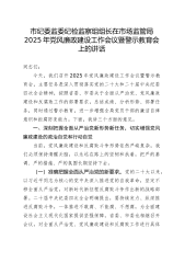 市纪委监委纪检监察组组长在市场监管局2025年党风廉政建设工作会议暨警示教育会上的讲话同志们:今天,我们召开2025年党风廉政建设工作会议暨警示教育会,主要任务是深入贯彻落实党的二十大和二十届中央纪委四次全会精神,按照省委、市委关于全面从严治党、党风廉政建设和反腐败工作的部署要求,总结成绩、分析形势、部署任务,同时通过警示教育,进一步增强全局党员干部的廉洁自律意识和拒腐防变能力。下面,我讲三个方面的意见。一、深刻把握全面从严治党新形势新任务,切实增强党风廉政建设的政治自觉和行动自觉当前,党风廉政建设和反腐败斗争形势依然严峻复杂,我们必须保持清醒头脑,以永远在路上的坚韧和执着,把严的基调、严的措...