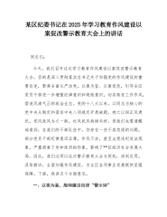 某区纪委书记在2025年学习教育作风建设以案促改警示教育大会上的讲话同志们:今天,我们召开这次学习教育作风建设以案促改警示教育大会,目的是深入贯彻落实总书记关于加强党的作风建设的重要论述,聚焦全面从严治党,以案为鉴、以案促改,引导全区党员干部进一步增强纪律意识和规矩意识,切实转变工作作风,营造风清气正的政治生态。党的十八大以来,以同志为核心的党中央从制定和落实中央八项规定开局破题,持之以恒正风肃纪,党风政风为之一新,社风民风持续向好。但我们也要清醒地看到,在我们的干部队伍中,仍存在一些不容忽视的问题,部分党员干部纪律意识淡薄,作风不实,甚至出现违纪违法现象,严重损害了党和政府的形象,影响了**...