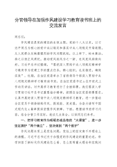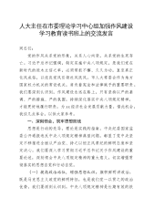 人大主任在市委理论学习中心组加强作风建设学习教育读书班上的交流发言同志们:党的作风关系党的形象,关系人心向背,关系党的生死存亡。习近平总书记强调,制定实施中央八项规定,是我们党在新时代的徙木立信之举,必须常抓不懈、久久为功,直至真正化风成俗,以优良党风引领社风民风。市人大常委会作为地方国家权力机关的常设机关,肩负着宪法和法律赋予的重要职责。我们要深刻认识到,作风建设永远在路上,只有坚持以严的基调、严的措施、严的氛围,持续深化落实中央八项规定精神,才能更好地履行职责,为xx经济社会发展贡献力量。借此机会,我谈几点体会,以供大家参考。一、深刻领会,筑牢思想防线思想是行动的先导,理论是实践的指南。中...