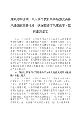 深入贯彻中央八项规定精神学习教育专题党课讲稿:以作风建设学习教育为契机,持续强化新时代党性锤炼与作风建设同志们:按照局党组深入贯彻中央八项规定学习教育工作部署,今天,我们开展一堂专题党课,目的是深入学习贯彻习近平总书记关于作风建设的重要论述,结合深入贯彻中央八项规定精神学习教育,以及当前党风廉政建设和反腐败斗争形势,以中央纪委国家监委通报的典型案例为镜鉴,深刻剖析作风问题的党性根源,明确改进方向。党的作风问题,关系党的生死存亡,关系人心向背,必须从政治高度、理论深度、实践力度上严肃对待。一、作风问题本质是党性问题,必须从政治原则高度深刻认识马克思主义认为,政党是阶级的政治组织,党性是阶级性的集...