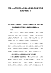 2025年全面深入贯彻八项规定精神学习教育加强党的作风建设的重要论述专题党课讲稿2篇例文【供参考】2025年贯彻八项规定精神学习教育加强党的作风建设的重要论述专题党课讲稿:以彻底的自我革命精神将作风建设持续引向深入党的作风建设是全面从严治党的重要组成部分,是党的自我革命中具有引领意义和内生作用的关键环节。1月6日,习近平总书记在二十届中央纪委四次全会上发表重要讲话强调:“进入新时代,面对党内党风廉政建设和反腐败斗争的突出问题,我们坚持有腐必反、有贪必肃,不断纯洁干部队伍,维护了党的形象,巩固了红色江山,赢得了确保党不变质、不变色、不变味的历史主动,赢得了党团结带领全体人民为强国建设、民族复兴伟...