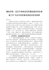2024年落实全面从严治党主体责任和党风廉政建设责任制“一岗双责”述责述廉报告2024年以来,在市委、市政府的正确领导下,我始终坚持以习近平新时代中国特色社会主义思想为指导,深入学习贯彻党的二十大和二十届二中、三中全会精神,认真履行全面从严治党主体责任和党风廉政建设责任制“一岗双责”,以强烈的政治责任感和使命感、永远在路上的政治定力,扎实推进分管领域党建、党风廉政建设和反腐败斗争纵深推进,现将有关情况汇报如下。一、强化思想政治建设,夯实理想信念根基一是持续加强理论武装。将思想理论武装与理想信念教育视作从严管党治党的关键举措,以身作则带动并引领分管、代管部门的党员干部深入学习贯彻习近平新时代中国...