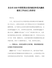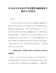 在2026年乡全面从严治党暨党风廉政建设专题会议上的讲话同志们:今天,我们在这里召开全乡全面从严治党暨党风廉政建设专题会议,主要任务是深入学习贯彻总书记关于党的自我革命的重要思想,全面落实党的二十届四中全会精神和中央、省、市、县纪委全会部署,总结回顾我乡2025年的工作,分析研判当前形势,安排部署下一阶段重点任务。刚才,我们共同学习了总书记的重要论述,*同志也汇报了全乡今年以来党风廉政建设工作情况,并通报了相关典型案例,内容详实,剖析深刻,为我们敲响了警钟,也指明了方向。大家要认真领会,抓好落实。下面,我结合我乡实际,讲四点意见。一、提高政治站位,深刻领会全面从严治党的时代内涵与极端重要性党的...
