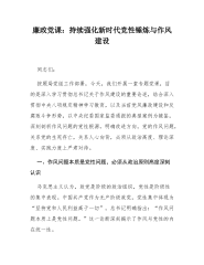 廉政党课:健全党员干部作风教育长效机制,以作风建设激发干事创业新担当党的作风关系党的形象,关系人心向背,关系党的生死存亡。党的十八大以来,以同志为核心的党中央从制定和落实中央八项规定开局破题,持之以恒推进党的作风建设,党风政风为之一新,民风社风持续向好,为党和国家各项事业发展提供了有力保证。作风建设是一项长期性、战略性工作,不可能一蹴而就、一劳永逸,必须不断强化党的作风建设常态化长效化建设。作为“关键少数”的党员干部是党和国家事业发展的骨干力量,在党的作风建设中具有重要作用。新时代新征程,必须始终将党的作风教育作为干部教育的必修课常修课,不断建立健全完善干部作风教育的长效机制,为推进党的作风建...