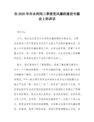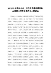 在局2025年上半年履行全面从严治党主体责任暨党风廉政建设工作专题会议上的讲话同志们:今天召开这次专题会议,主要任务是深入学习贯彻习近平新时代中国特色社会主义思想,全面落实党的二十大和二十届二中、三中全会精神,以及二十届中央纪委四次全会的决策部署,系统总结我局2025年上半年履行全面从严治党主体责任和党风廉政建设工作情况,深刻剖析当前存在的不足与挑战,研究部署下半年重点工作。目的就是要进一步统一思想、凝聚共识,以永远在路上的清醒和坚定,推动我局全面从严治党向纵深发展,为XX市机关事务工作实现高质量发展提供更加坚强有力的政治保障和纪律保障。下面,我讲三点意见。一、上半年工作完成情况2025年上半...