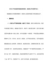 2022年抓基层党建述职报告(集团公司党委书记)根据集团公司党委部署要求,现将本人抓基层党建工作情况报告如下。一、履职情况(一)落实“从严”要求抓党建,做到“三个到位”。履行主体责任到位。制定年度党建工作要点,逐级签订责任书、承诺书,细化责任清单,进行任务分解。党委书记履行第一责任人责任,班子成员履行“一岗双责”。严格党委会议事规则,围绕中心工作,管方向,把大局,保落实。从严管党治党到位。召开专题党风廉政建设会议,分析形势,部署任务,推进责任落实。定期听取纪委汇报,坚定支持纪委“三转”。强化理论武装到位。积极推进“**”学习教育常态化制度化,严格“三会一课”、主题党日制度,共组织党委理论中心组...