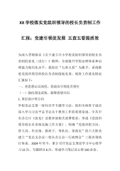 XX学校落实党组织领导的校长负责制工作汇报;党建引领促发展五查五看提质效为深入贯彻落实《关于建立中小学校党组织领导的校长负责制的意见(试行)》精神,全面提升学校治理体系和治理能力现代化水平,我校以“五查五看”为抓手,系统推进党组织领导的校长负责制落地见效。现将工作落实情况汇报如下:一、查思想认识深度,看政治引领是否到位(一)强化理论武装,凝聚思想共识1. 顶层设计明方向学校党总支第一时间召开专题学习会,组织全体班子成员深入学习习近平总书记关于教育工作的重要论述、中共中央办公厅《意见》及教育部相关部署要求,形成《党组织领导校长负责制实施工作方案》,明确“党组织把方向、管大局、作决策、抓班子、带队...